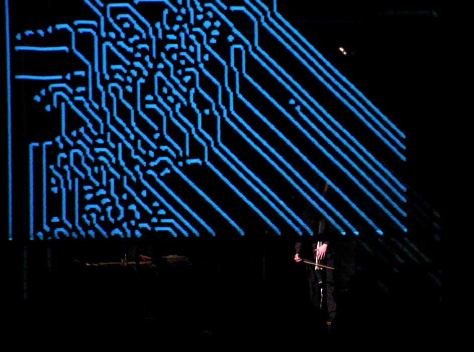Das Spiel des Bassisten und das Ambiente des Aufführungsraumes, inklusive Publikum, findet Eingang in eine Maschinerie aus Rechnern, Programmen Sensoren und Controlern, wird dort dem o.g. "Strickmuster" unterzogen und auf 2-8 Lautsprecherkanäle und 1-3 Videoleinwände wieder in die Echtzeit eingespeist.