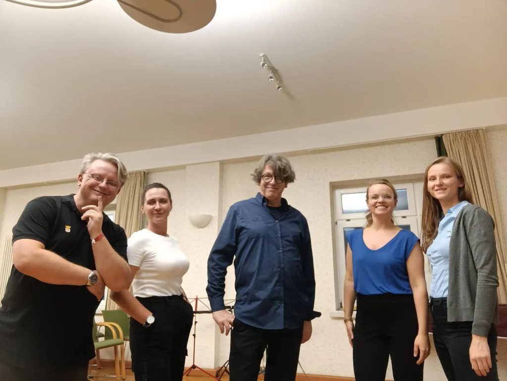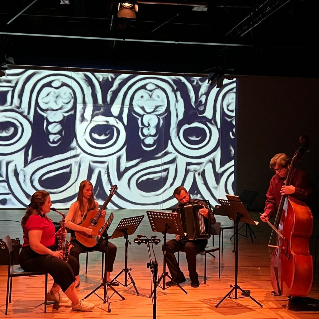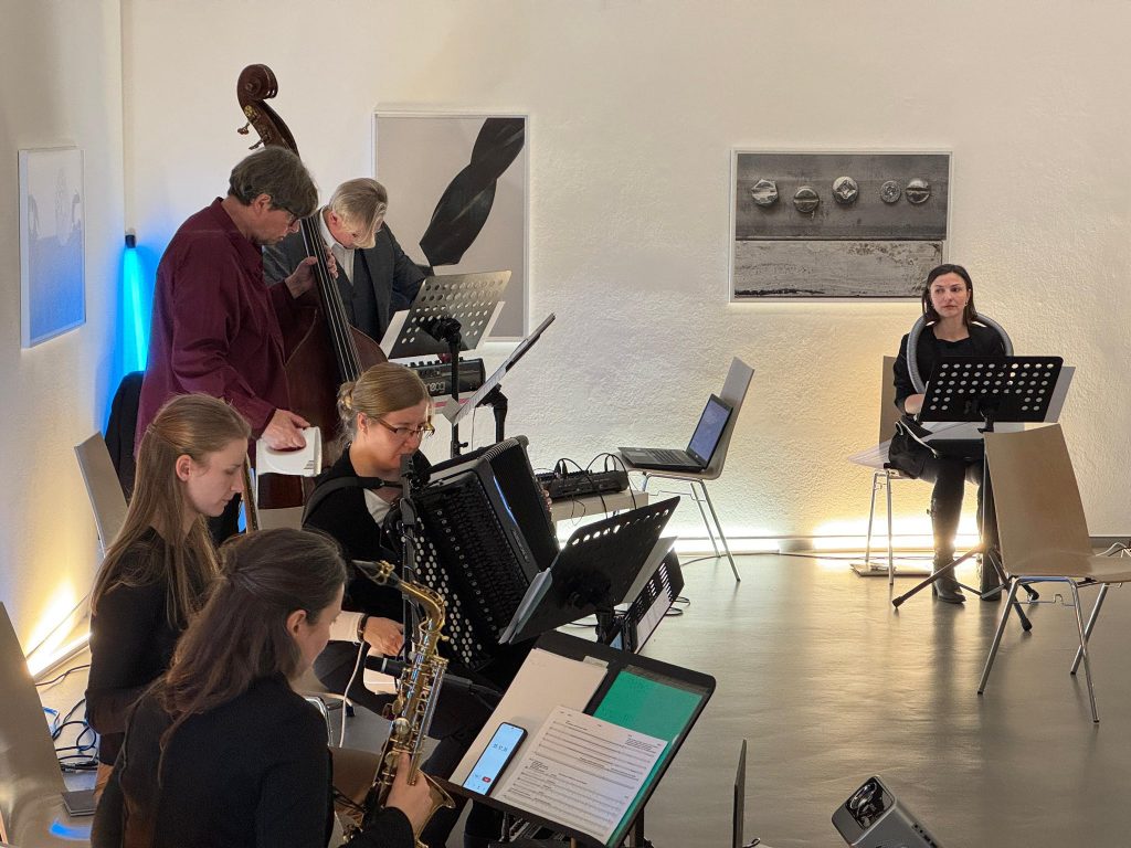 v.l.n.r. Johannes K. Hildebrandt (Elektronik), Maria Löschner (Akkordeon), Silvia Kopáčová (Gitarre), Irina Yudaeva (Saxophon), Henry Mex (Kontrabass), Giordano Bruno do Nascimento (E-Gitarre)